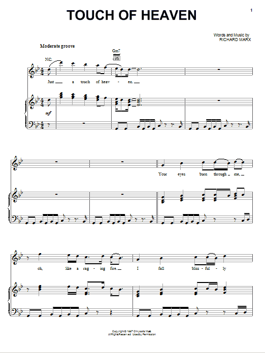 Download or print Richard Marx Touch Of Heaven sheet music, chords and digital score arranged for Piano, Vocal & Guitar Chords (Right-Hand Melody). This Pop score includes 6 page(s).