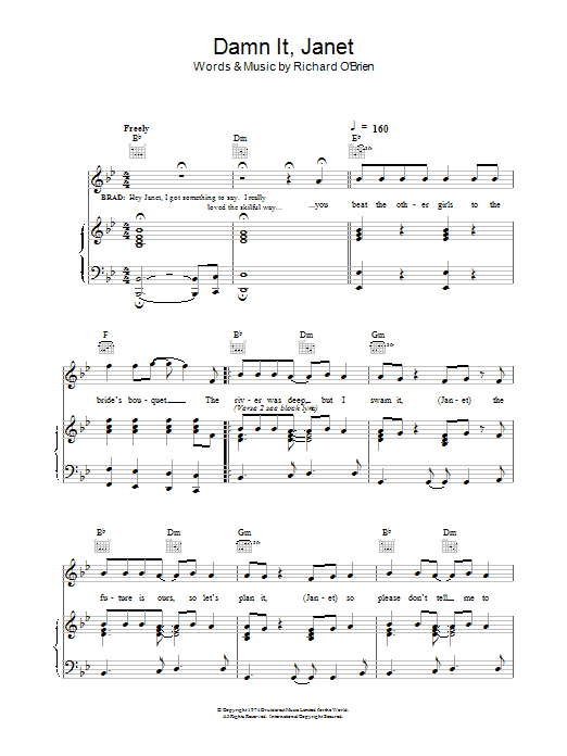 Download or print Richard O'Brien Damn It, Janet sheet music, chords and digital score arranged for Piano, Vocal & Guitar Chords. This Film/TV score includes 5 page(s).