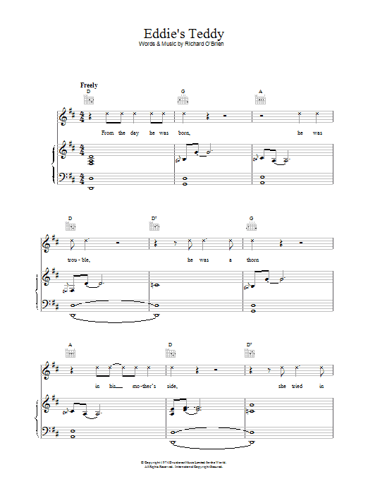 Download or print Richard O'Brien Eddie's Teddy sheet music, chords and digital score arranged for Piano, Vocal & Guitar Chords. This Film/TV score includes 6 page(s).