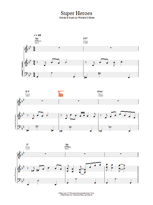 Download or print Richard O'Brien Super Heroes sheet music, chords and digital score arranged for Piano, Vocal & Guitar Chords. This Film/TV score includes 3 page(s).