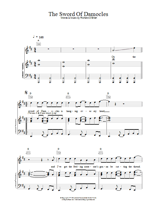 Download or print Richard O'Brien The Sword Of Damocles sheet music, chords and digital score arranged for Piano, Vocal & Guitar Chords. This Film/TV score includes 5 page(s).