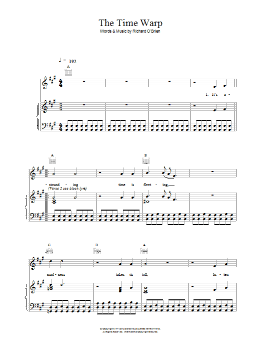 Download or print Richard O'Brien Time Warp sheet music, chords and digital score arranged for Piano, Vocal & Guitar Chords (Right-Hand Melody). This Film/TV score includes 7 page(s).