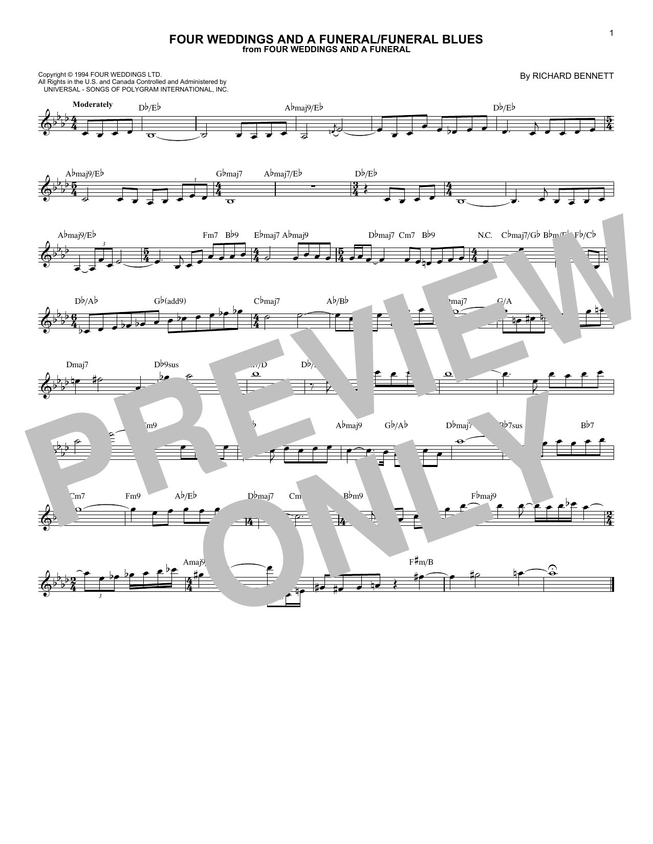 Download or print Richard Rodney Bennett Four Weddings And A Funeral/Funeral Blues sheet music, chords and digital score arranged for Lead Sheet / Fake Book. This Film/TV score includes 1 page(s).
