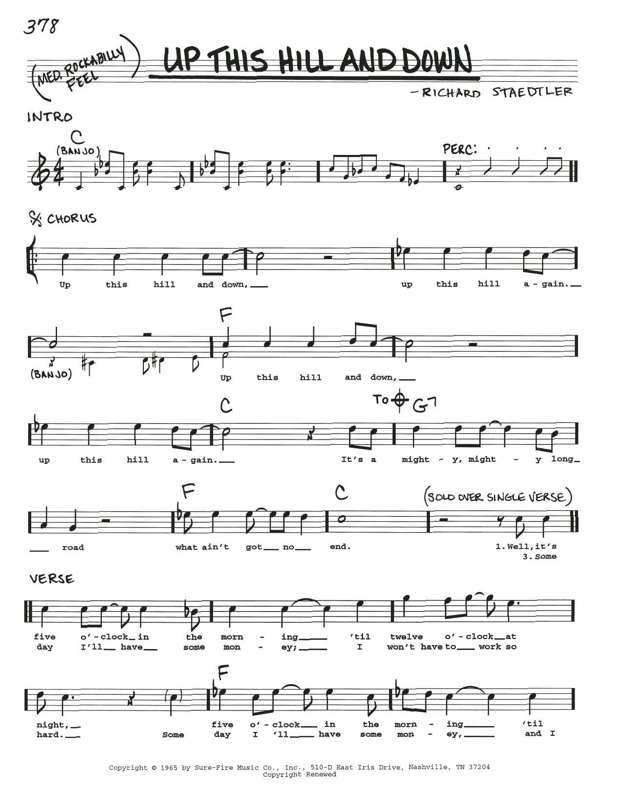 Download or print Richard Staedtler Up This Hill And Down sheet music, chords and digital score arranged for Real Book – Melody, Lyrics & Chords. This Jazz score includes 2 page(s).