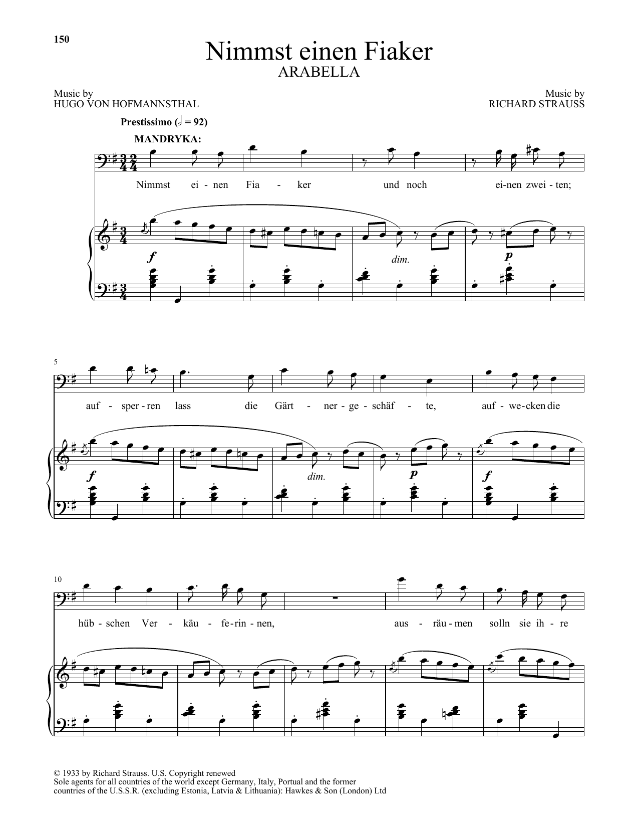 Download or print Richard Strauss Nimmst einen Fiaker (from Arabella) sheet music, chords and digital score arranged for Piano & Vocal. This Classical score includes 3 page(s).