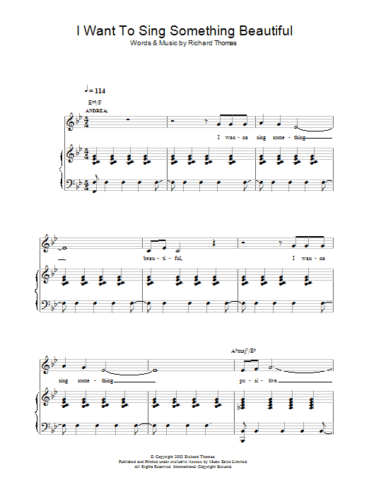 Download or print Richard Thomas I Want To Sing Something Beautiful (from Jerry Springer The Opera) sheet music, chords and digital score arranged for Piano, Vocal & Guitar Chords. This Musical/Show score includes 4 page(s).