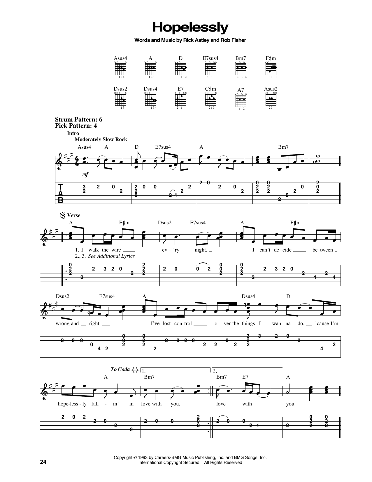 Download or print Rick Astley Hopelessly sheet music, chords and digital score arranged for Piano, Vocal & Guitar Chords (Right-Hand Melody). This Pop score includes 6 page(s).