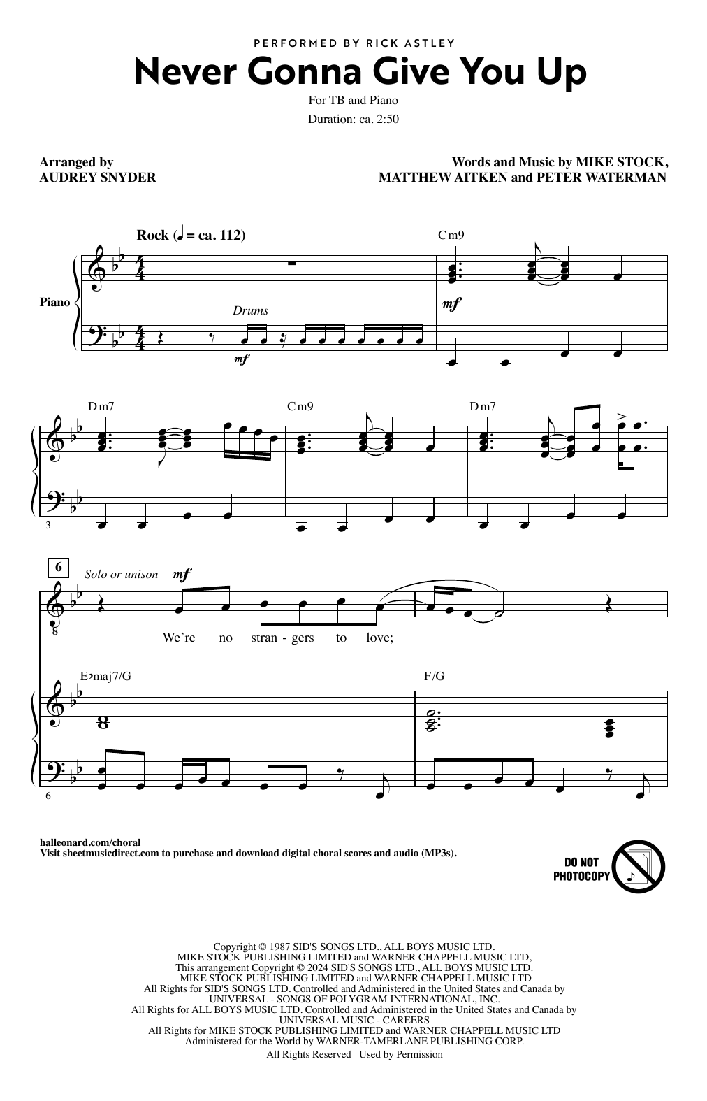 Download or print Rick Astley Never Gonna Give You Up (arr. Audrey Snyder) sheet music, chords and digital score arranged for TB Choir. This Pop score includes 11 page(s).