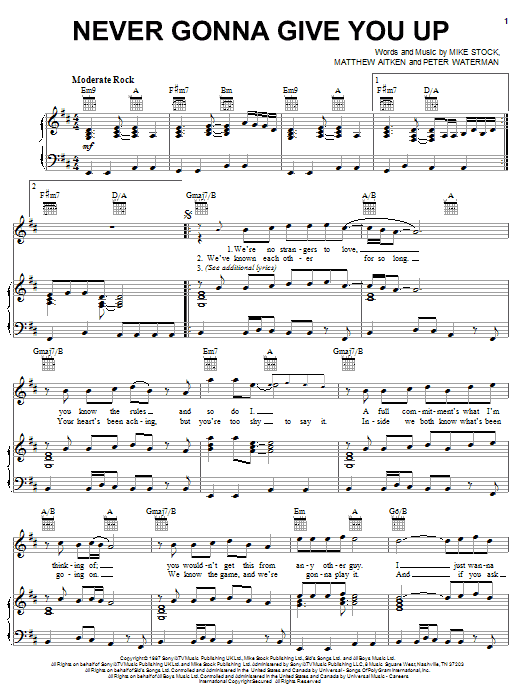 Download or print Rick Astley Never Gonna Give You Up sheet music, chords and digital score arranged for Easy Piano. This Pop score includes 5 page(s).
