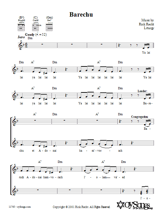 Download or print Rick Recht Barechu sheet music, chords and digital score arranged for Lead Sheet / Fake Book. This Traditional score includes 2 page(s).