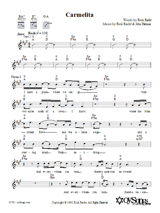 Download or print Rick Recht Carmelita sheet music, chords and digital score arranged for Lead Sheet / Fake Book. This Traditional score includes 5 page(s).