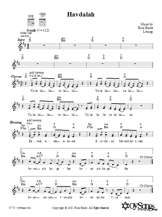 Download or print Rick Recht Havdalah sheet music, chords and digital score arranged for Lead Sheet / Fake Book. This Traditional score includes 3 page(s).