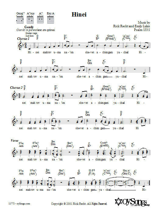 Download or print Rick Recht Hinei sheet music, chords and digital score arranged for Lead Sheet / Fake Book. This Traditional score includes 2 page(s).