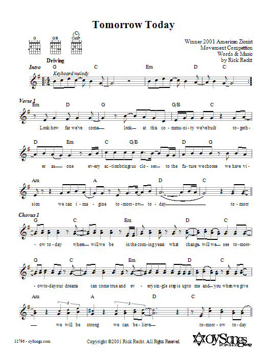 Download or print Rick Recht Tomorrow Today sheet music, chords and digital score arranged for Lead Sheet / Fake Book. This Traditional score includes 4 page(s).