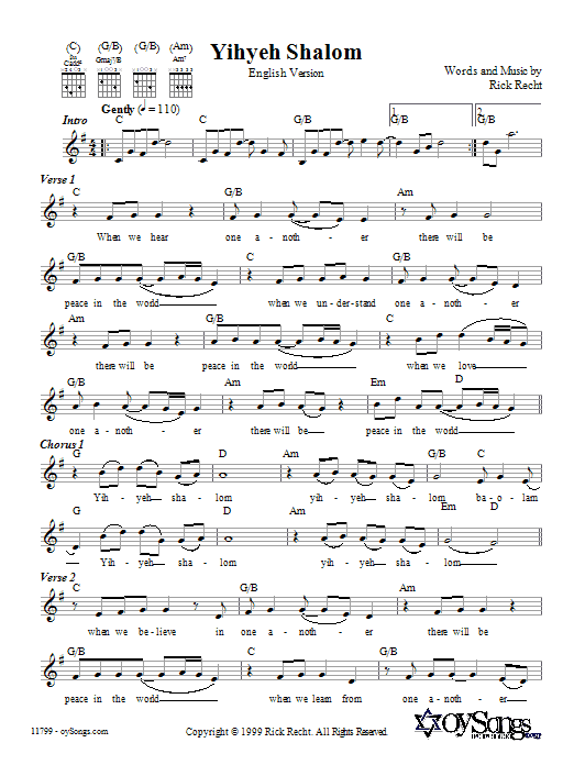 Download or print Rick Recht Yihyeh Shalom (English version) sheet music, chords and digital score arranged for Lead Sheet / Fake Book. This Traditional score includes 2 page(s).