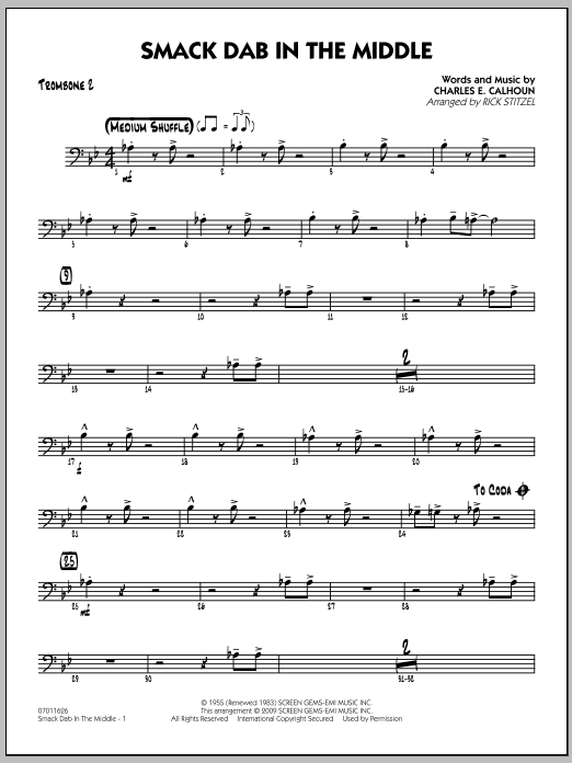 Download or print Rick Stitzel Smack Dab In The Middle - Trombone 2 sheet music, chords and digital score arranged for Jazz Ensemble. This Blues score includes 2 page(s).