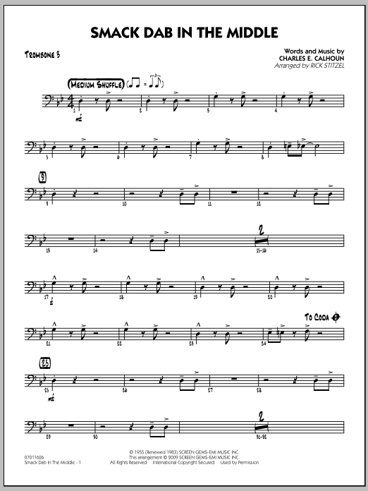 Download or print Rick Stitzel Smack Dab In The Middle - Trombone 3 sheet music, chords and digital score arranged for Jazz Ensemble. This Blues score includes 2 page(s).