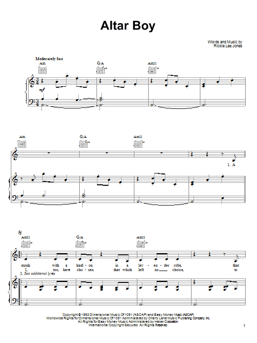 Download or print Rickie Lee Jones Altar Boy sheet music, chords and digital score arranged for Piano, Vocal & Guitar Chords (Right-Hand Melody). This Folk score includes 5 page(s).