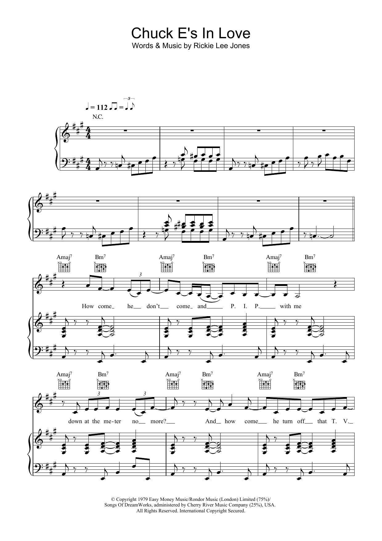 Download or print Rickie Lee Jones Chuck E's In Love sheet music, chords and digital score arranged for Guitar Chords/Lyrics. This Pop score includes 3 page(s).