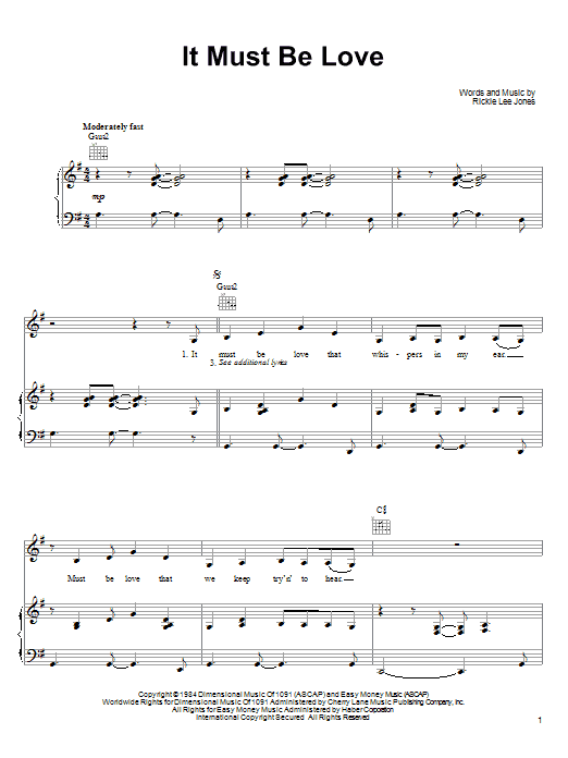 Download or print Rickie Lee Jones It Must Be Love sheet music, chords and digital score arranged for Piano, Vocal & Guitar Chords (Right-Hand Melody). This Film/TV score includes 5 page(s).