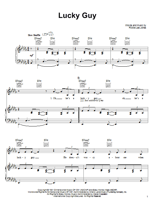 Download or print Rickie Lee Jones Lucky Guy sheet music, chords and digital score arranged for Piano, Vocal & Guitar Chords (Right-Hand Melody). This Folk score includes 6 page(s).