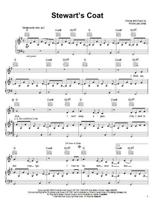 Download or print Rickie Lee Jones Stewart's Coat sheet music, chords and digital score arranged for Piano, Vocal & Guitar Chords (Right-Hand Melody). This Folk score includes 5 page(s).