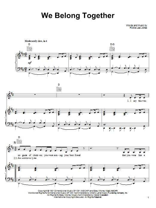 Download or print Rickie Lee Jones We Belong Together sheet music, chords and digital score arranged for Piano, Vocal & Guitar Chords (Right-Hand Melody). This Folk score includes 6 page(s).