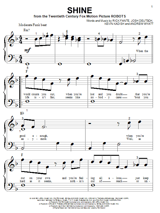 Download or print Ricky Fante Shine sheet music, chords and digital score arranged for Piano, Vocal & Guitar Chords (Right-Hand Melody). This Film/TV score includes 7 page(s).