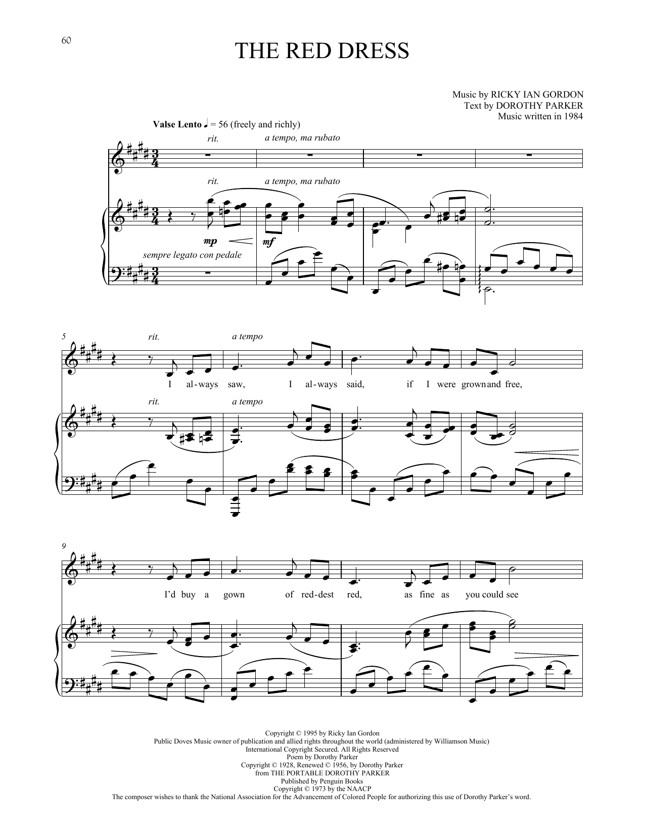 Download or print Ricky Ian Gordon The Red Dress sheet music, chords and digital score arranged for Piano & Vocal. This Classical score includes 3 page(s).
