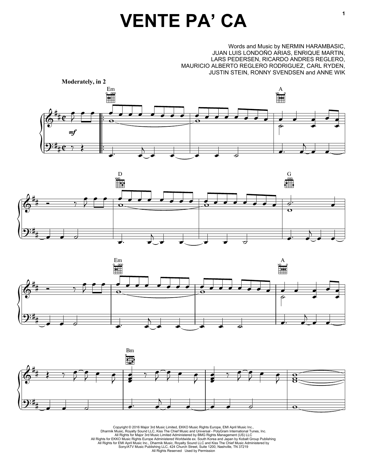 Download or print Ricky Martin Vente Pa' Ca (Feat. Maluma) sheet music, chords and digital score arranged for Piano, Vocal & Guitar Chords (Right-Hand Melody). This Pop score includes 9 page(s).
