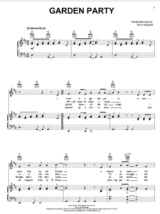 Download or print Ricky Nelson Garden Party sheet music, chords and digital score arranged for Piano, Vocal & Guitar Chords (Right-Hand Melody). This Country score includes 3 page(s).