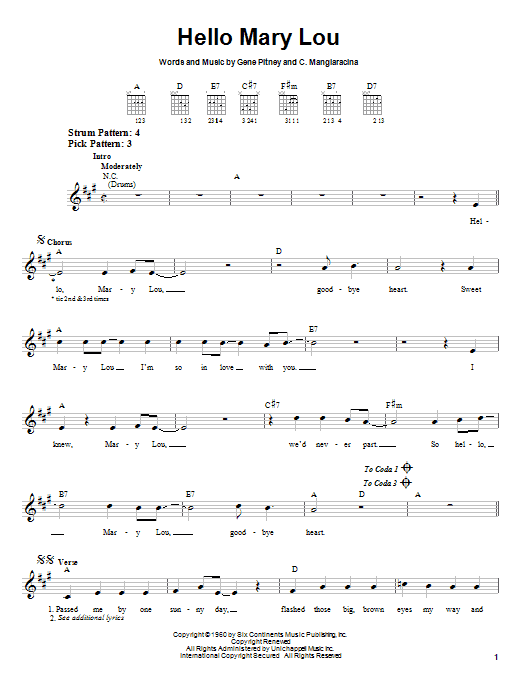 Download or print Ricky Nelson Hello Mary Lou sheet music, chords and digital score arranged for Piano, Vocal & Guitar Chords (Right-Hand Melody). This Country score includes 3 page(s).