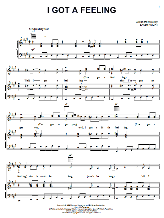 Download or print Ricky Nelson I Got A Feeling sheet music, chords and digital score arranged for Piano, Vocal & Guitar Chords (Right-Hand Melody). This Oldies score includes 4 page(s).