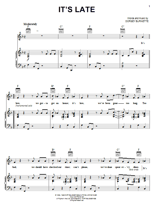 Download or print Ricky Nelson It's Late sheet music, chords and digital score arranged for Piano, Vocal & Guitar Chords (Right-Hand Melody). This Oldies score includes 3 page(s).