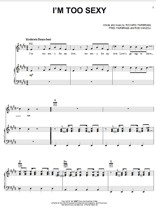 Download or print Right Said Fred I'm Too Sexy sheet music, chords and digital score arranged for Piano, Vocal & Guitar Chords (Right-Hand Melody). This Disco score includes 5 page(s).