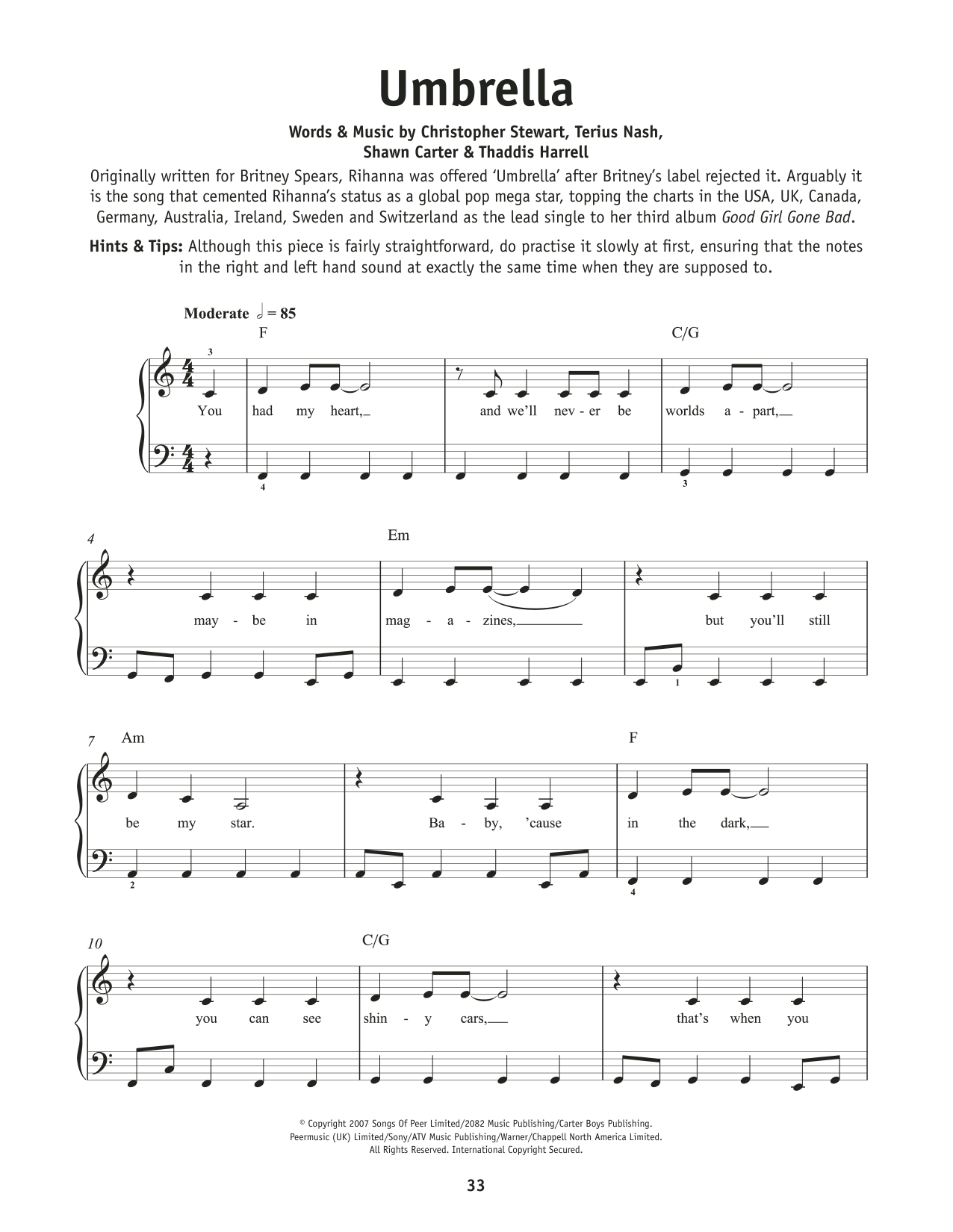 This composition is beautifuly arranged for Really Easy Piano includes 3 page(s). It is performed by Rihanna and Jay-Z. The style of the score is 'Pop'. Catalog SKU number of the notation is 1614459.