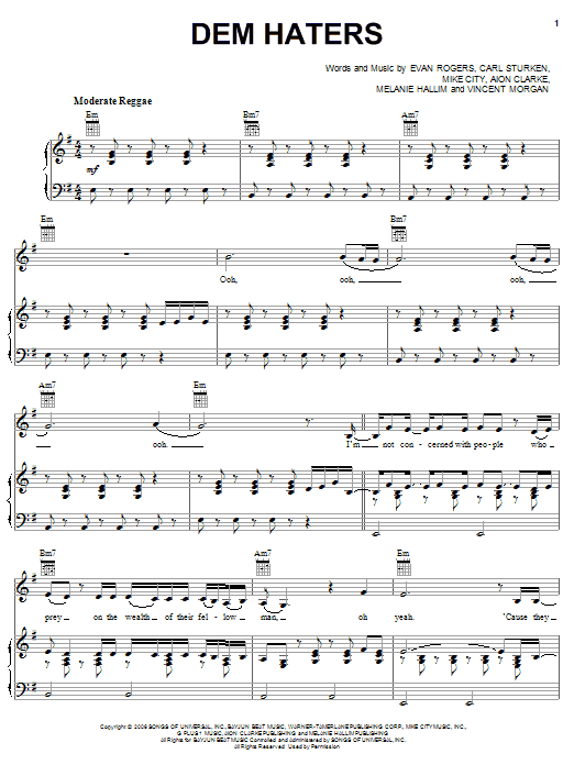 Download or print Rihanna Dem Haters sheet music, chords and digital score arranged for Piano, Vocal & Guitar Chords (Right-Hand Melody). This Pop score includes 6 page(s).
