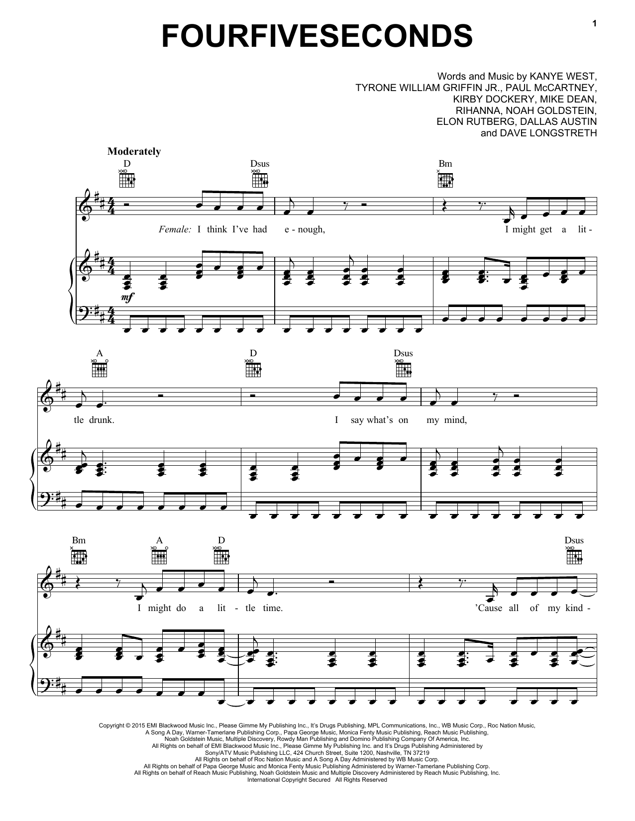 Download or print Rihanna & Kanye West & Paul McCartney FourFiveSeconds sheet music, chords and digital score arranged for Piano, Vocal & Guitar Chords (Right-Hand Melody). This Pop score includes 6 page(s).