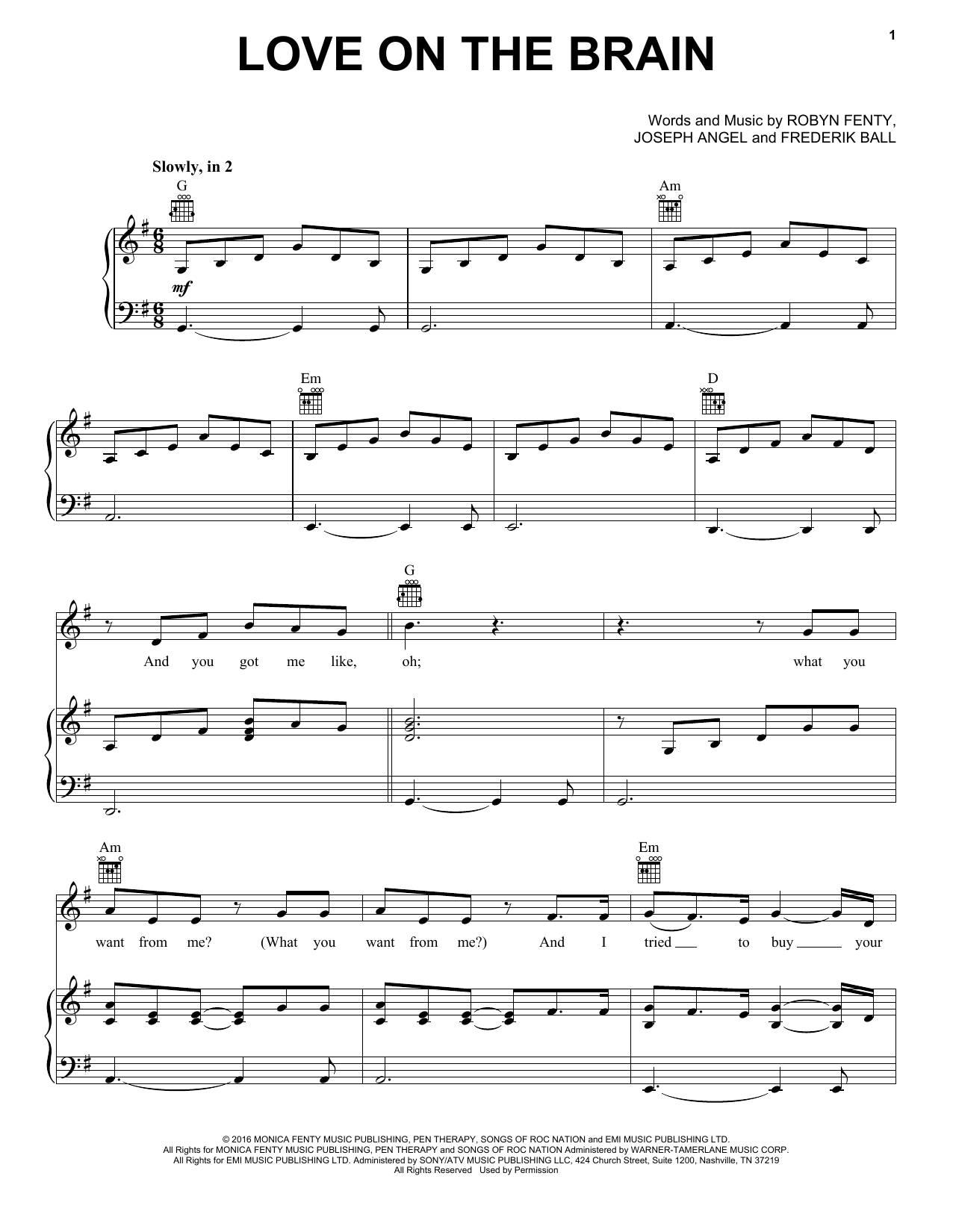 Download or print Rihanna Love On The Brain sheet music, chords and digital score arranged for Easy Piano. This Pop score includes 5 page(s).