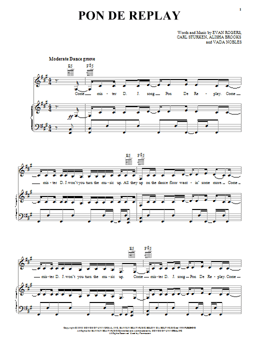 Download or print Rihanna Pon De Replay sheet music, chords and digital score arranged for Piano, Vocal & Guitar Chords (Right-Hand Melody). This Hip-Hop score includes 9 page(s).