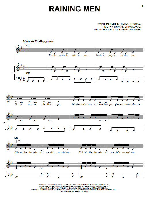 Download or print Rihanna Raining Men sheet music, chords and digital score arranged for Piano, Vocal & Guitar Chords (Right-Hand Melody). This Pop score includes 8 page(s).