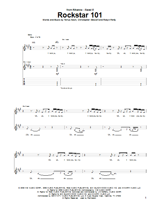 Download or print Rihanna Rockstar 101 sheet music, chords and digital score arranged for Guitar Tab. This Pop score includes 7 page(s).