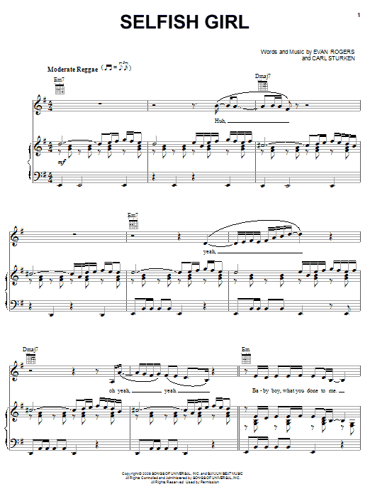 Download or print Rihanna Selfish Girl sheet music, chords and digital score arranged for Piano, Vocal & Guitar Chords (Right-Hand Melody). This Pop score includes 8 page(s).