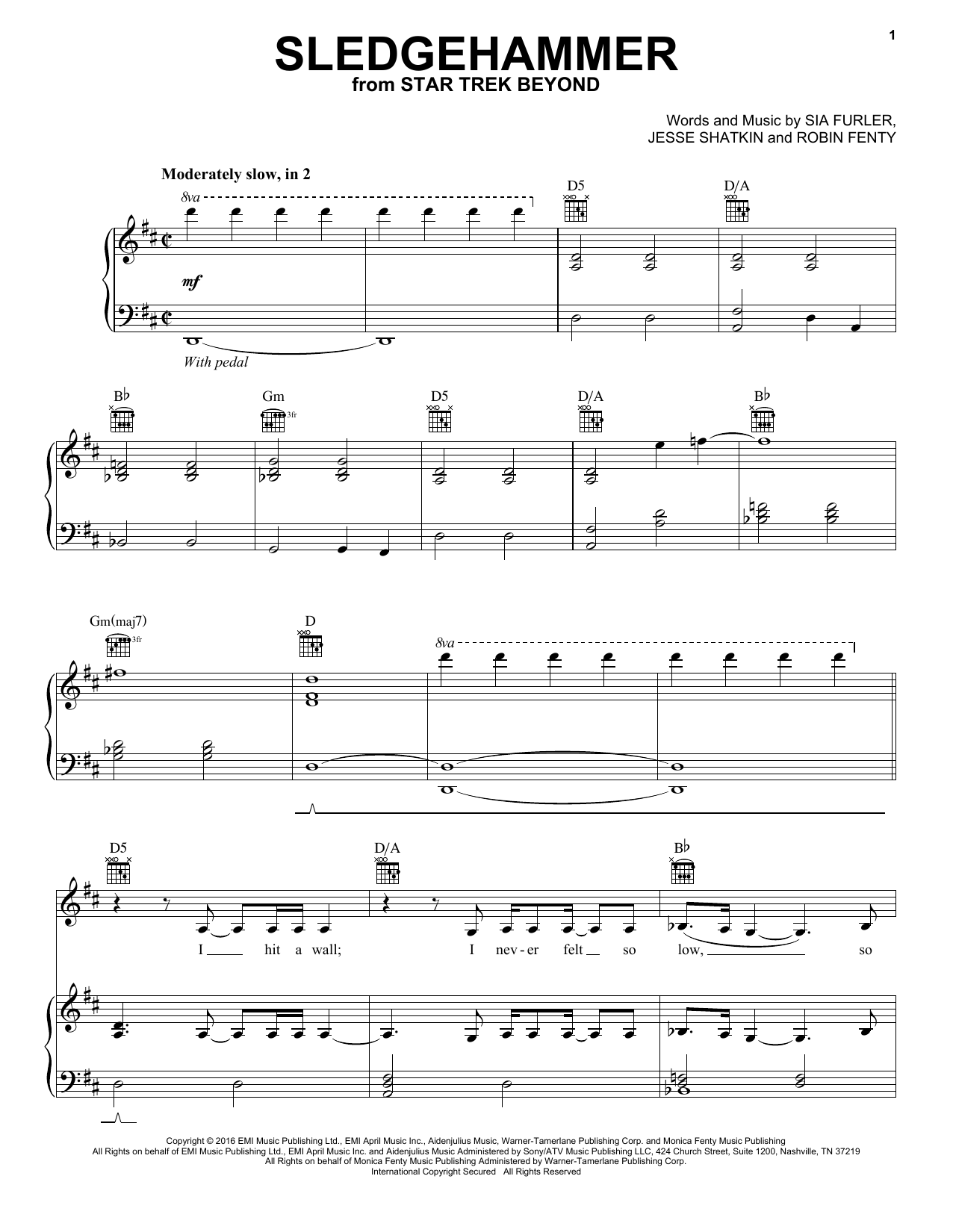 Download or print Rihanna Sledgehammer sheet music, chords and digital score arranged for Piano, Vocal & Guitar Chords (Right-Hand Melody). This Pop score includes 7 page(s).
