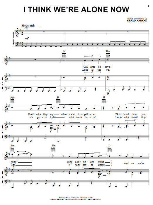 Download or print Tommy James And The Shondells I Think We're Alone Now sheet music, chords and digital score arranged for Piano, Vocal & Guitar Chords (Right-Hand Melody). This Oldies score includes 3 page(s).