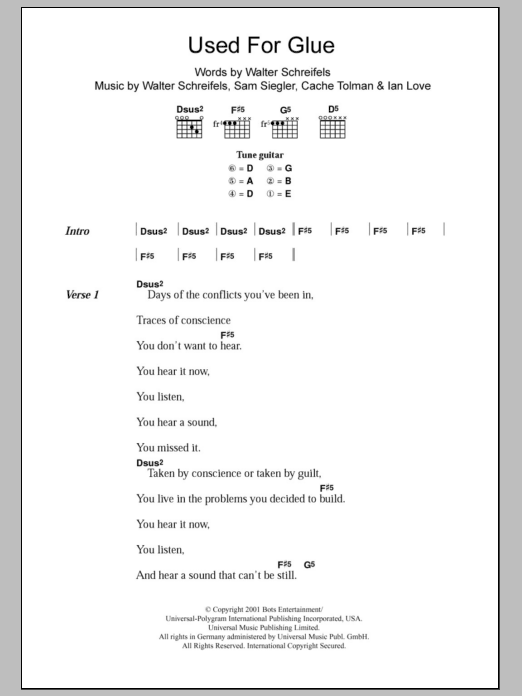 Download or print Rival Schools Used For Glue sheet music, chords and digital score arranged for Guitar Chords/Lyrics. This Rock score includes 3 page(s).