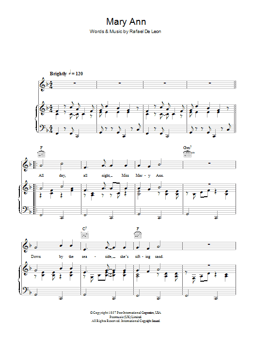 Download or print Roaring Lion Mary Ann sheet music, chords and digital score arranged for Piano, Vocal & Guitar Chords. This World score includes 4 page(s).