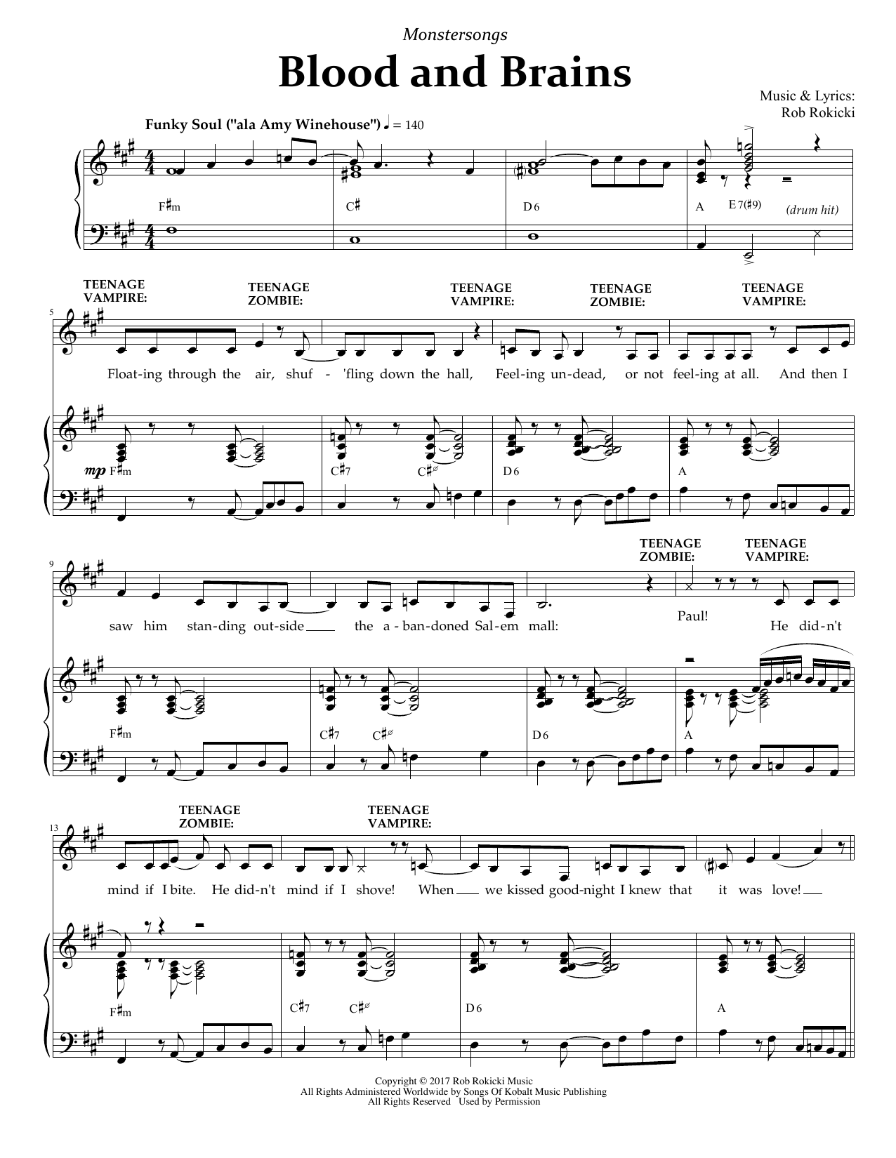 Download or print Rob Rokicki Blood And Brains (from Monstersongs) sheet music, chords and digital score arranged for Piano & Vocal. This Broadway score includes 7 page(s).