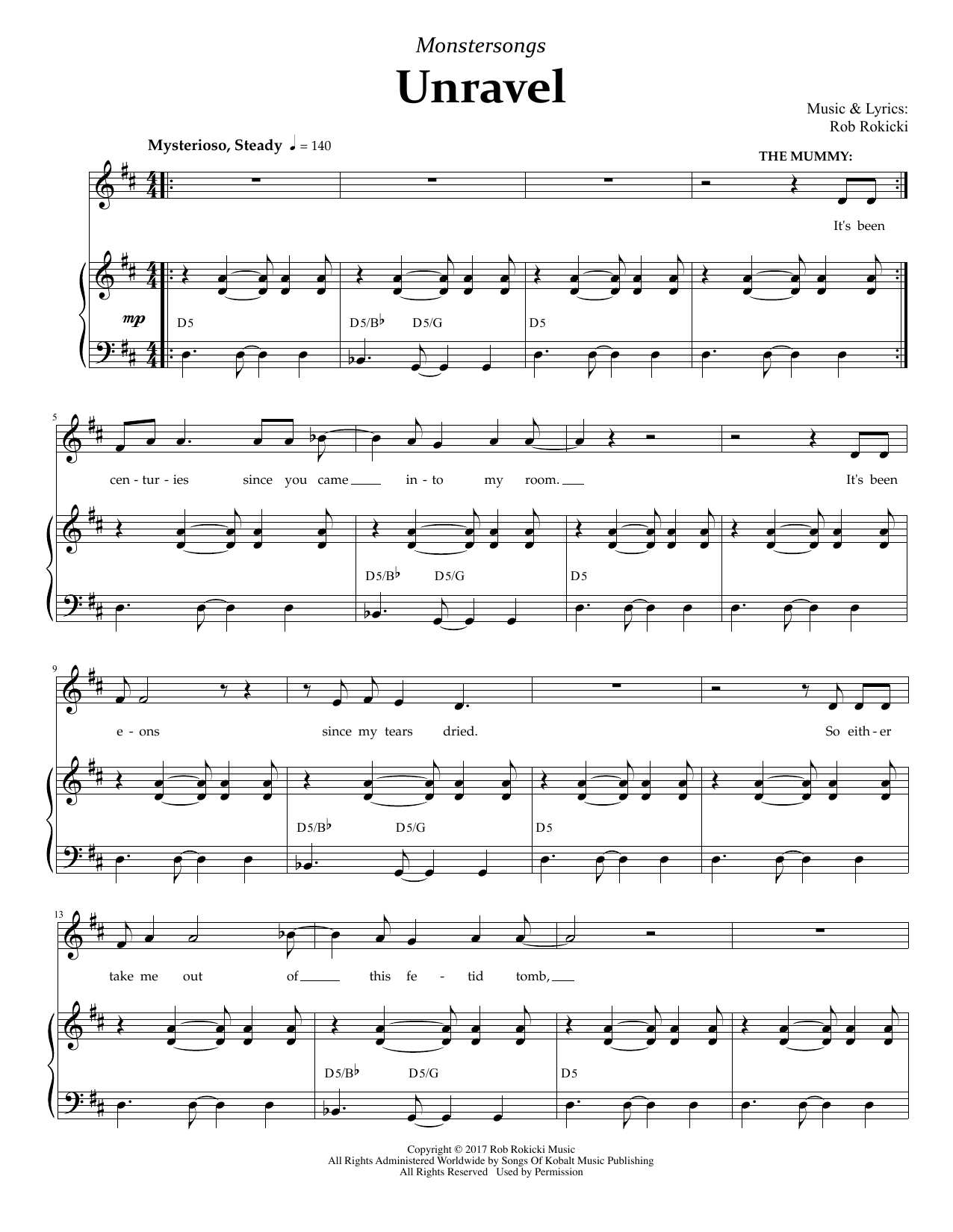 Download or print Rob Rokicki Unravel (from Monstersongs) sheet music, chords and digital score arranged for Piano & Vocal. This Broadway score includes 6 page(s).