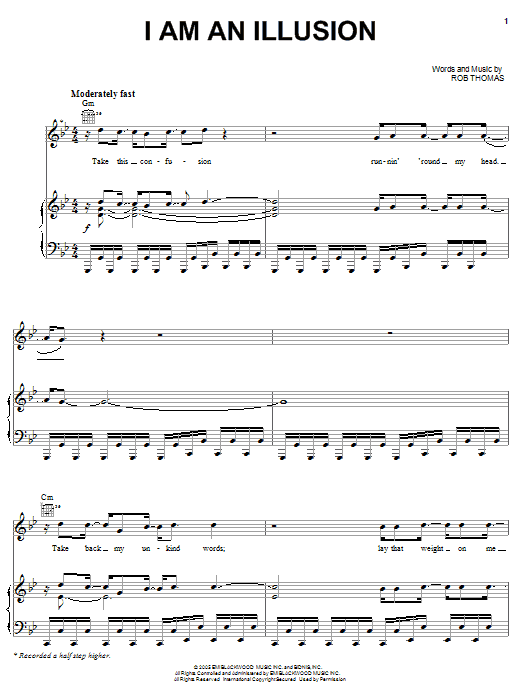 Download or print Rob Thomas I Am An Illusion sheet music, chords and digital score arranged for Piano, Vocal & Guitar Chords (Right-Hand Melody). This Pop score includes 9 page(s).
